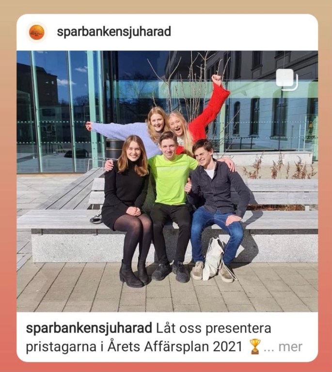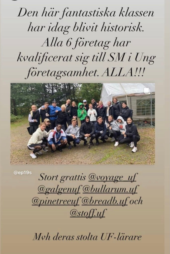 Citat: ”Vi är jättestolta att allt vårt hårda jobb gav resultat! Social hållbarhet är ju verkligen kärnan i vårt UF-företag så vinst i just den kategorin kändes extra rolig.” – Emelie Vesterlund, Produktionschef